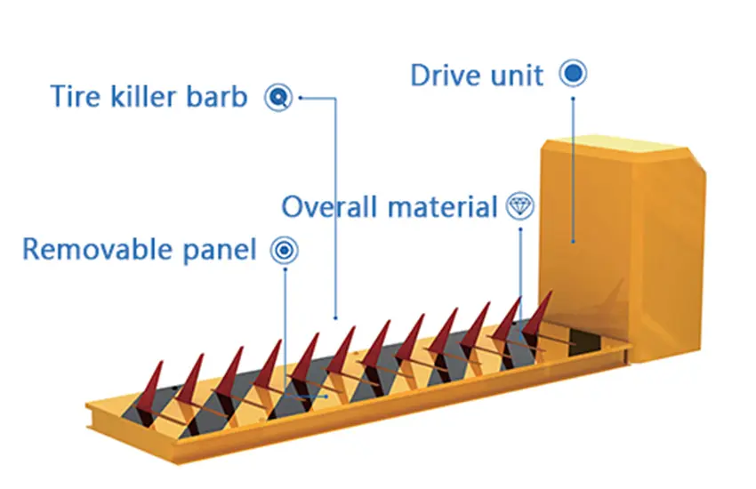 Tyre Killer combines two functions: speed bump and Tire Killer. It can control vehicle speed and prevent illegal entry.
